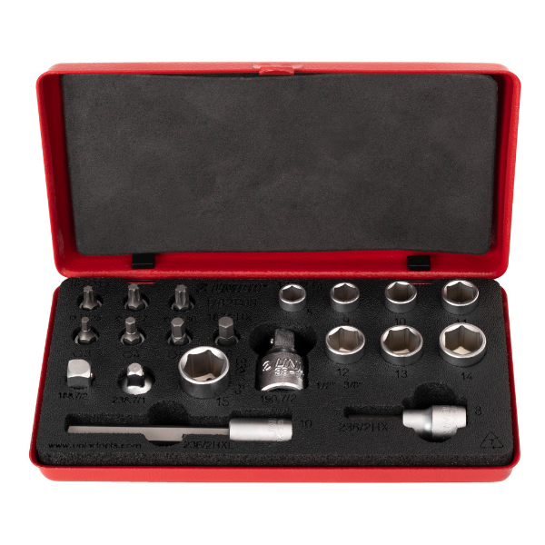 - Juego de puntas y vasos Unior para el mantenimiento de bicicletas, con todos los elementos necesarios para las tareas más comunes. Los vasos y puntas más pequeños son de 1/4" y los más grandes de 3/8". Para garantizar que todos los elementos se puedan usar con cualquier tamaño de carraca o llave dinamométrica, el juego también incluye dos adaptadores para usar de 1/4" a 3/8" y viceversa. Todos los elementos son compatibles con una carraca o llave dinamométrica. Todos los elementos del juego están perfectamente organizados en la bandeja de espuma SOS. El juego contiene: puntas Torx de tamaños T25, T27 y T30; puntas hexagonales de tamaños 3, 4, 5, 6, 8 y 10 mm; vasos de tamaños 8, 9, 10, 11, 12, 13, 14 y 15 mm; adaptadores de 1/4" a 3/8" y de 3/8" a 1/4".